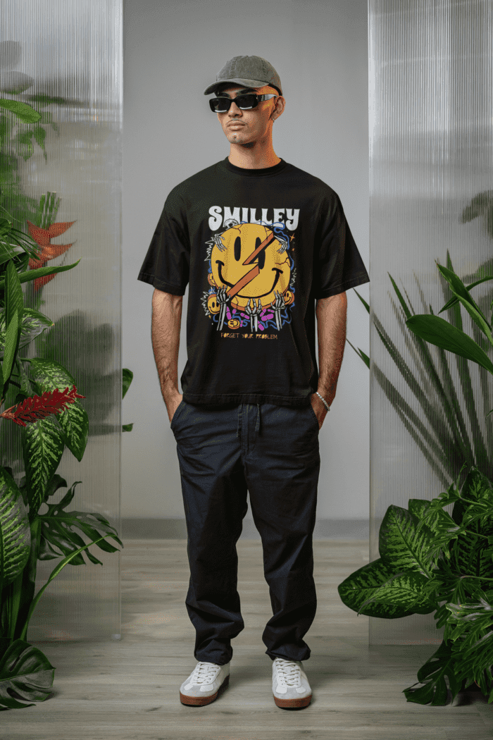 Smiley Oversized Black Printed T-Shirt CrossX